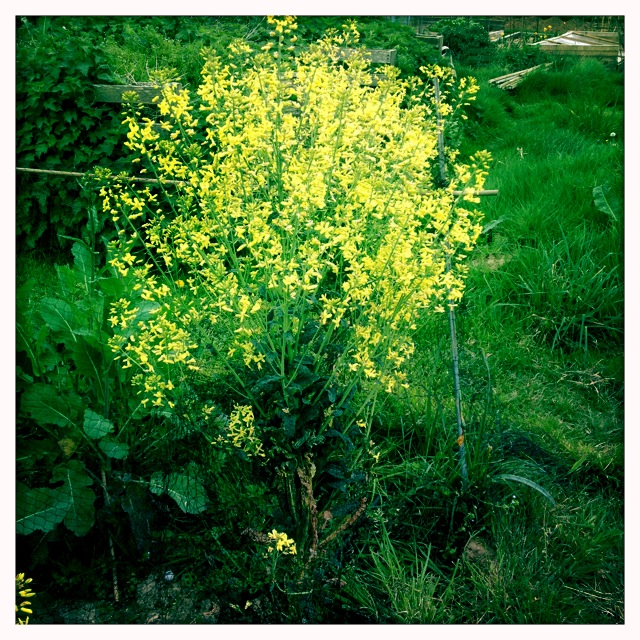 Currently there is very little growing on plot two. Just plants that we over-wintered. There is some parsley, some leeks and some kales plants that have gone to flower. I would have dug these out earlier as the leaves are now too tough to eat but they have been attracting bees.