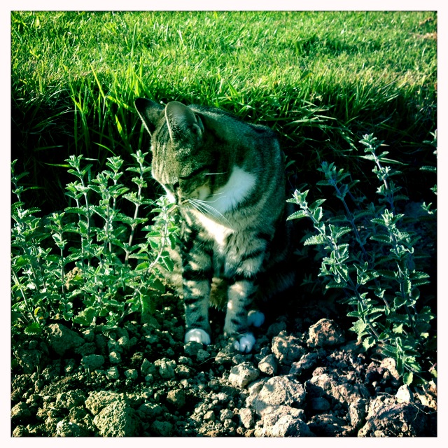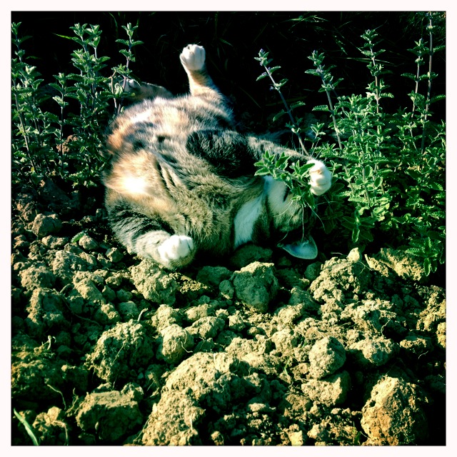 A furry feline pest…..it was Poppy the cat. She is a stray but is looked after by the lady who has the most wonderful wild plot opposite. Poppy often follows Sue to the allotment and spends her days basking in the sunshine. I adore cats but they are funny creatures. They will only visit if it suits them. Having never paid me any attention before it was clear Poppy wasn’t there to see me, but to enjoy the kitty pleasures of our Nepeta Six Hills Giant, commonly known as CATMINT!