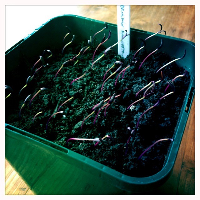 Last month we sowed Borlotti beans and Moonlight runner beans, both of which I managed to successfully kill whilst trying to harden the young plants off. The strong coastal winds wreaked havoc! So I re-sowed and now have new seedings.