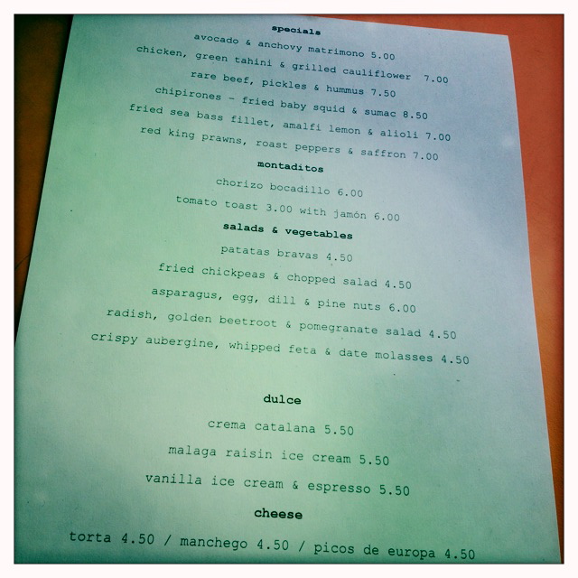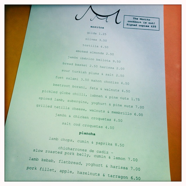 With the weather rather unsettled I decided to play hooky and head to London to go to one of my favourite restaurants, Morito. I left London just over three years ago and sadly there really isn’t anything close to this type of food in Hastings. Morito serve the most delicious tapas, their style is North Africa meets Spain with a little Middle East thrown in. The restaurant, along with Moro, is owned by the culinary geniuses, husband and wife, Sam and Sam Clark.