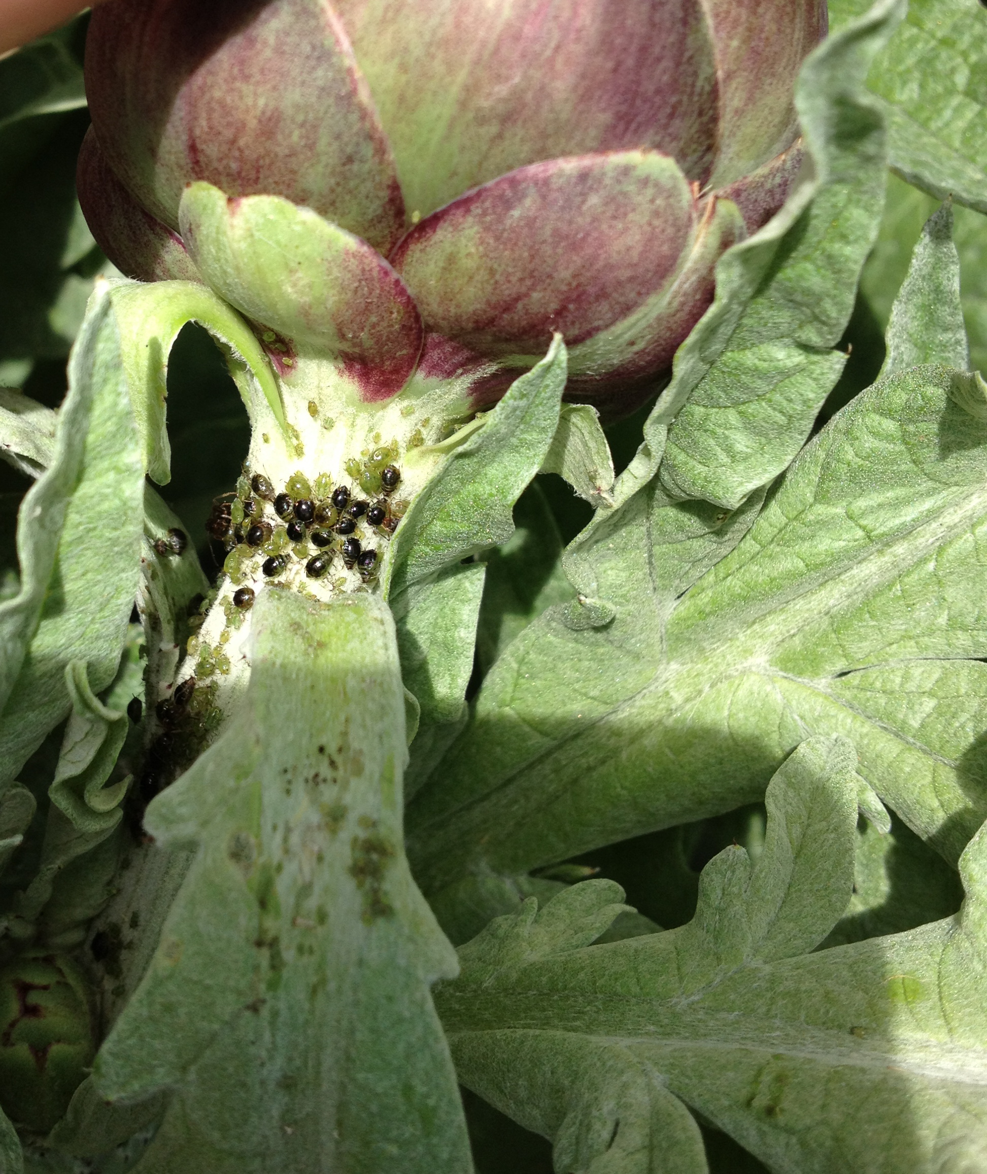 She removed the leaves directly under the globe and then removed…….. okay squashed, all the aphids. With no where to settle the globes have remained aphid free. The loss of leaves hasn’t impacted the growth rate of the globes, in fact these are the biggest and healthiest globe artichokes we have ever had.